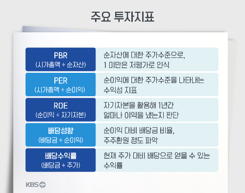 ●주가순자산비율(PBR :price to book value ratio // book value :자산가치) : 주가가 기업의 순자산에 비해 얼마나 평가받고 있는지를 나타냅니다. PBR이 낮은 경우, 기업이 저평가되었다고 볼 수 있습니다.